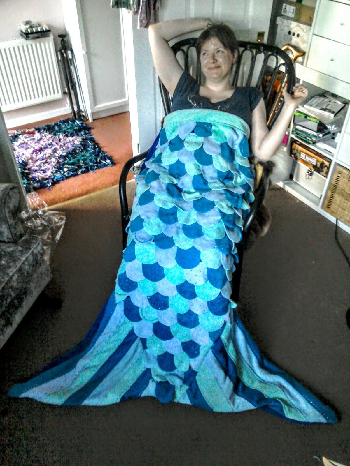 I made a mermaid's tail sleeping bag for my niece. I scrapped an earlier attempt because it was a bit too small - at least, a four year old would grow out of it in no time. The finished version should serve her well if she is still interested in being a mermaid into middle age.