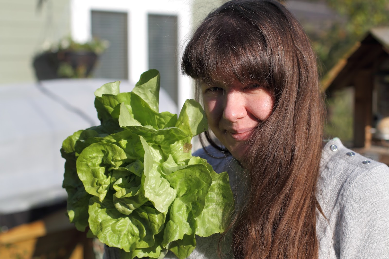 I model a winter lettuce - a woman with a lot of hair holds a lovely green lettuce as big as her head.